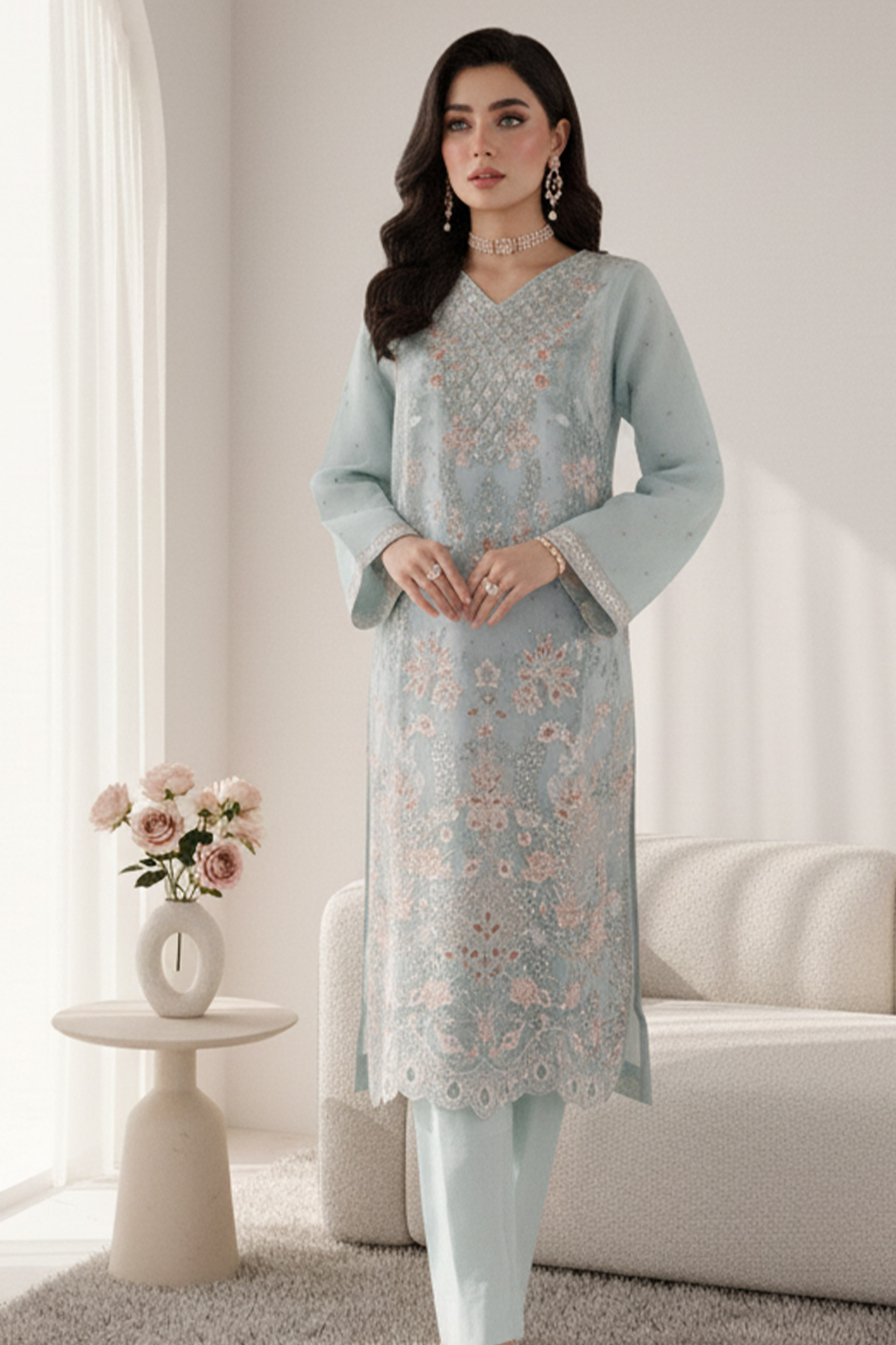 - Delicate thread & bead embellishments on the shirt
